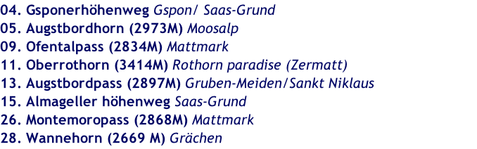 In de Visperdalen kunt u prachtige wandelingen maken. Het Mattertal staat bekend om Zermatt en Grächen. Hier zijn prachtige wandelingen te lopen.